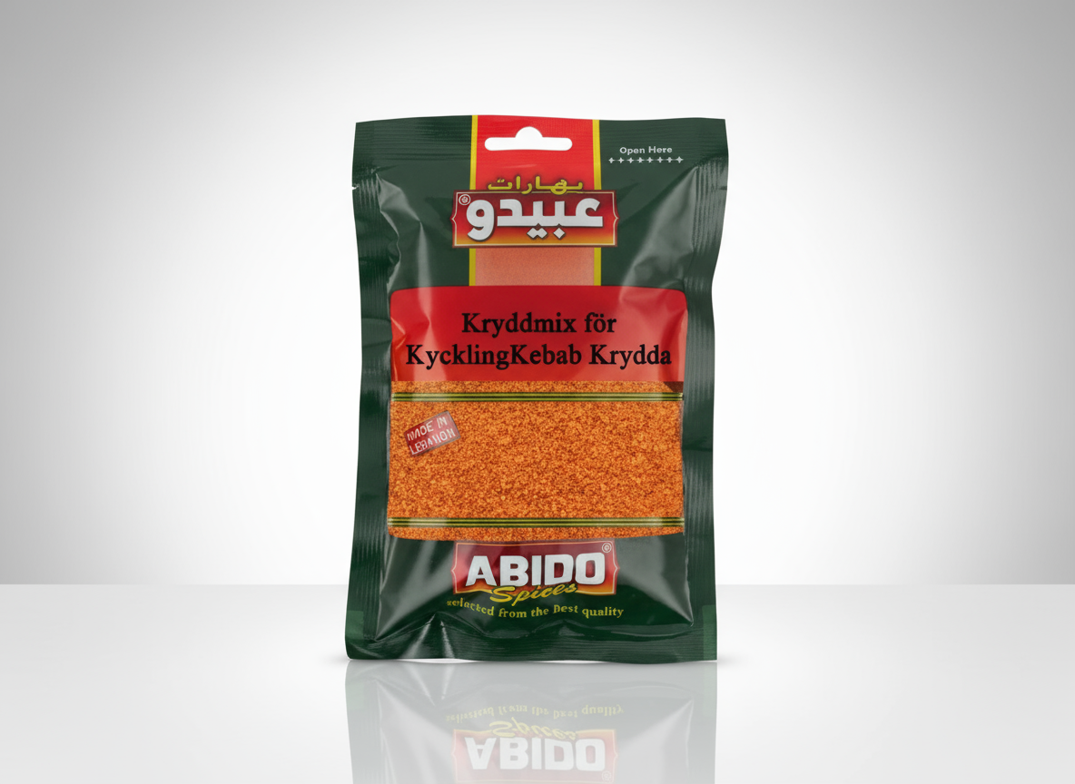 Abido Kycklingkebab Krydda 50 g är en färdig, välbalanserad kryddblandning som är speciellt framtagen för att ge äkta kebabsmak till kycklingrätter. Den innehåller en blandning av paprika, vitlök, spiskummin, koriander, peppar och örter, vilket ger en fyllig, lätt rökig och kryddig smak – precis som i klassisk mellanösternkebab.
