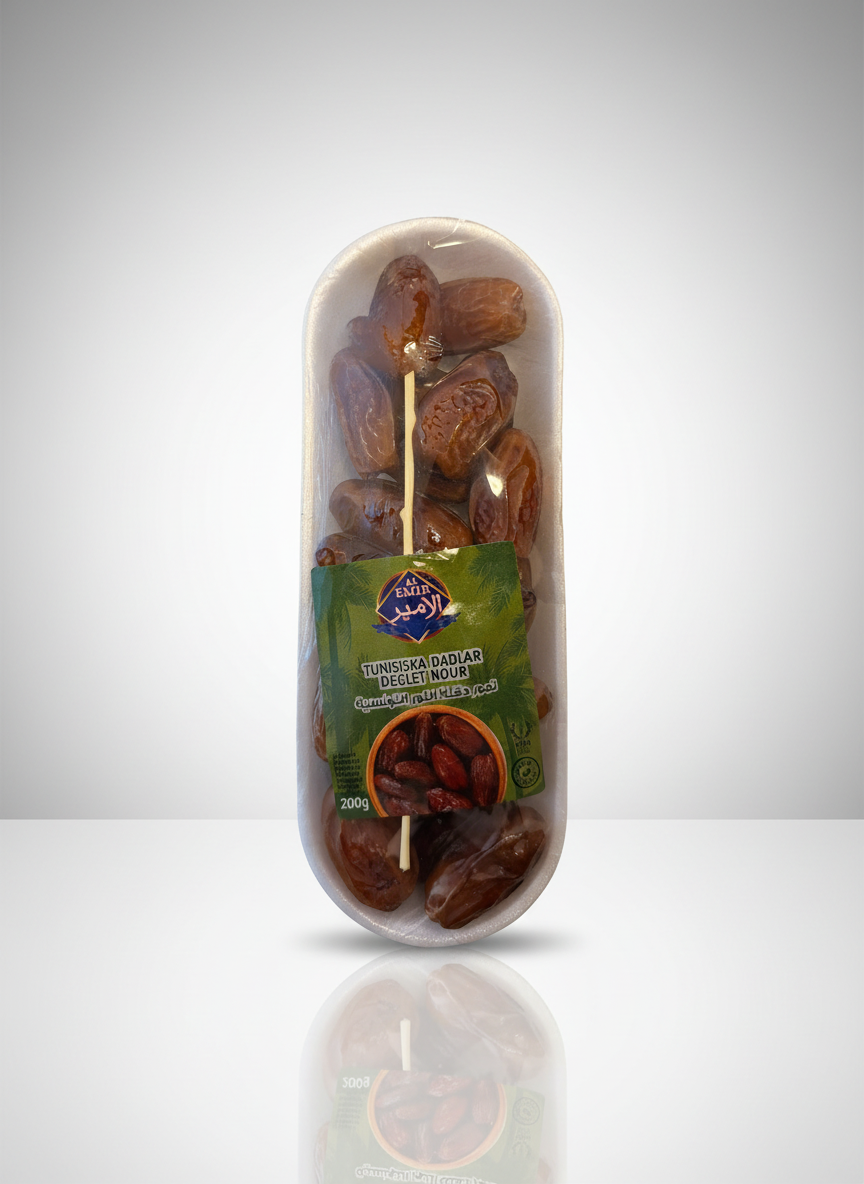 Al Emir Tunisisk Dadlar är noggrant utvalda för sin mjuka konsistens och naturliga sötma. Med sin gyllene färg och lena textur är de lika goda att äta som de är, som att använda i bakning och matlagning.